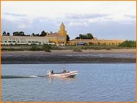 town lies past the salt pans and is reached by a ferryboat